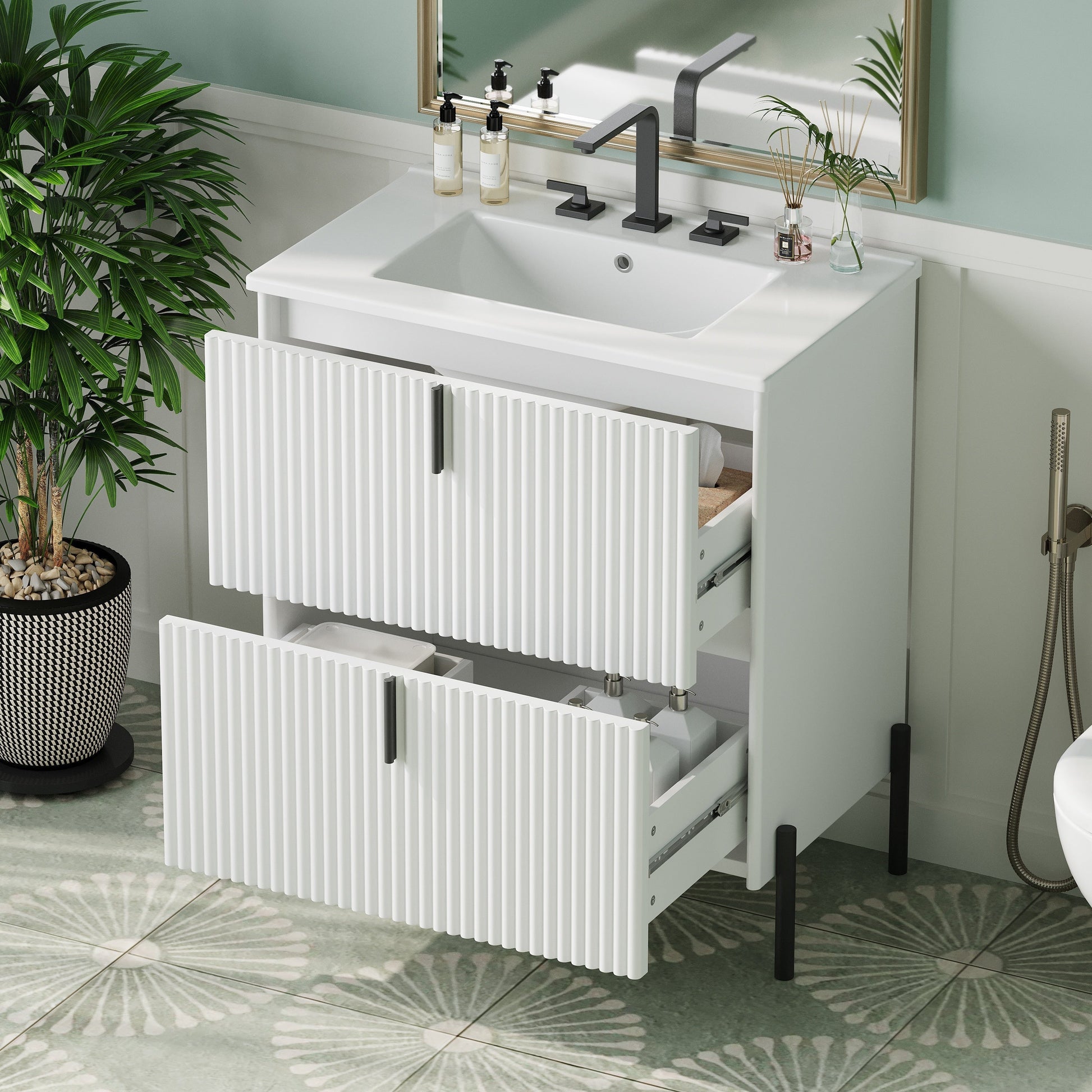 This white fluted bathroom vanity features a ceramic sink and soft-close drawers, designed to enhance both style and storage functionality in your bathroom space.