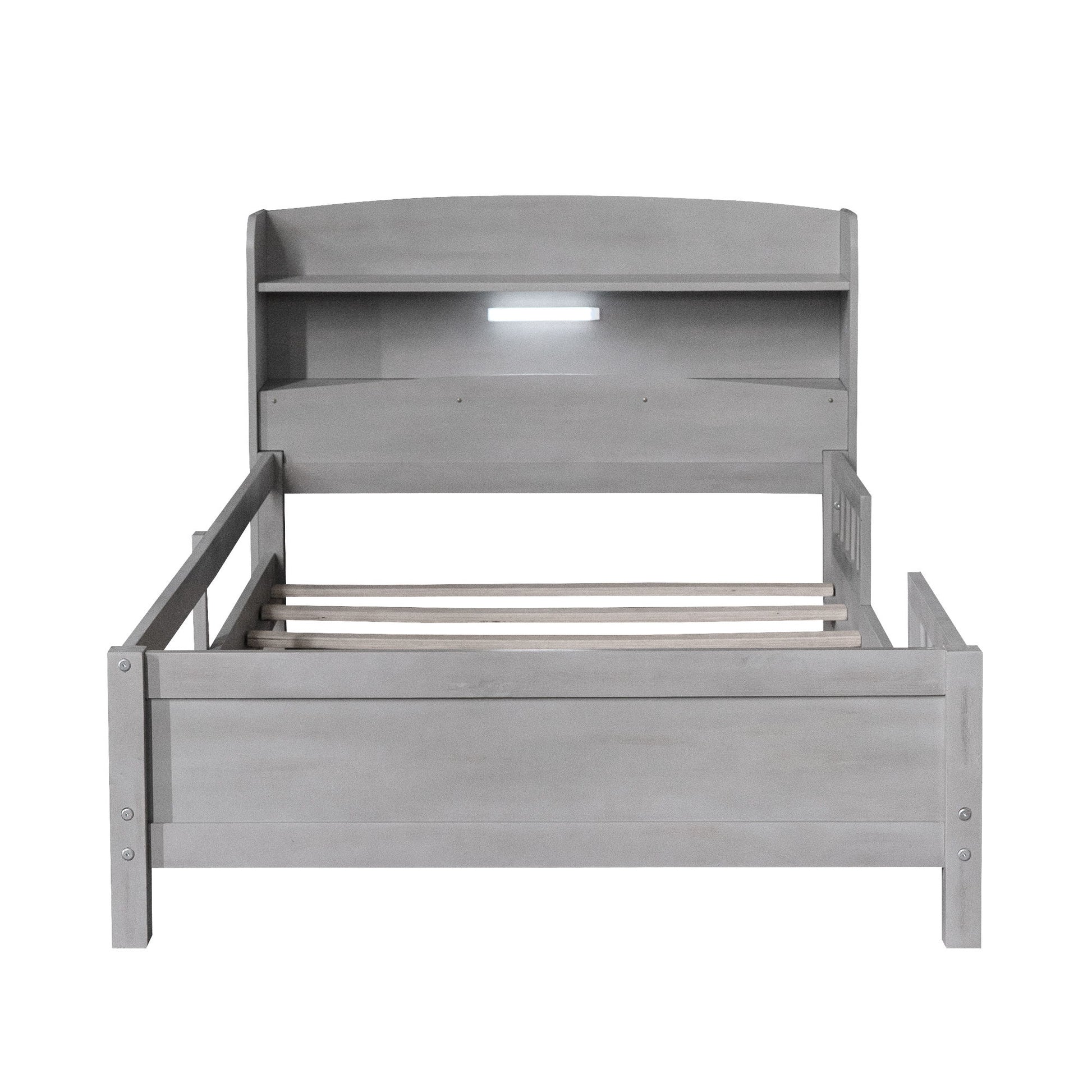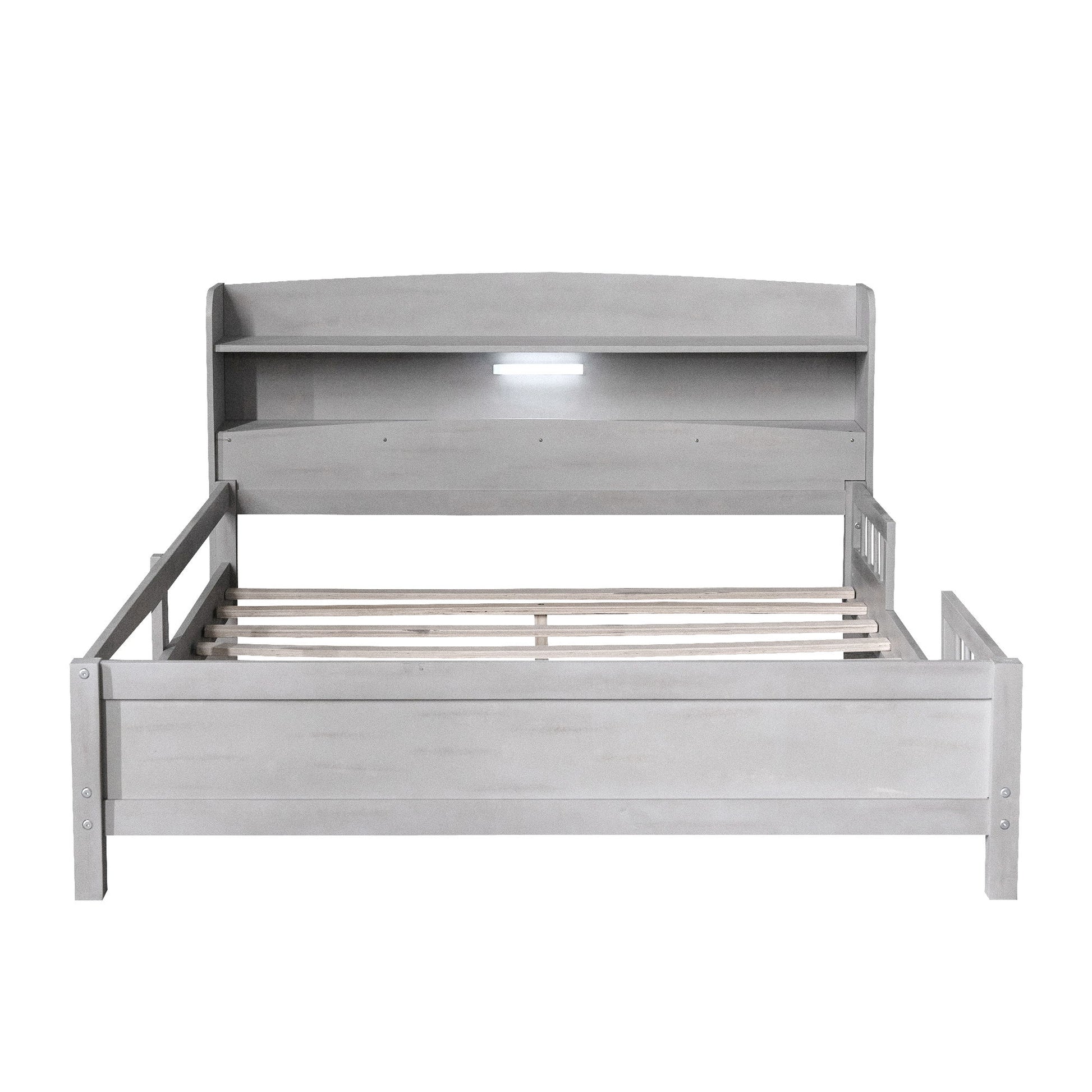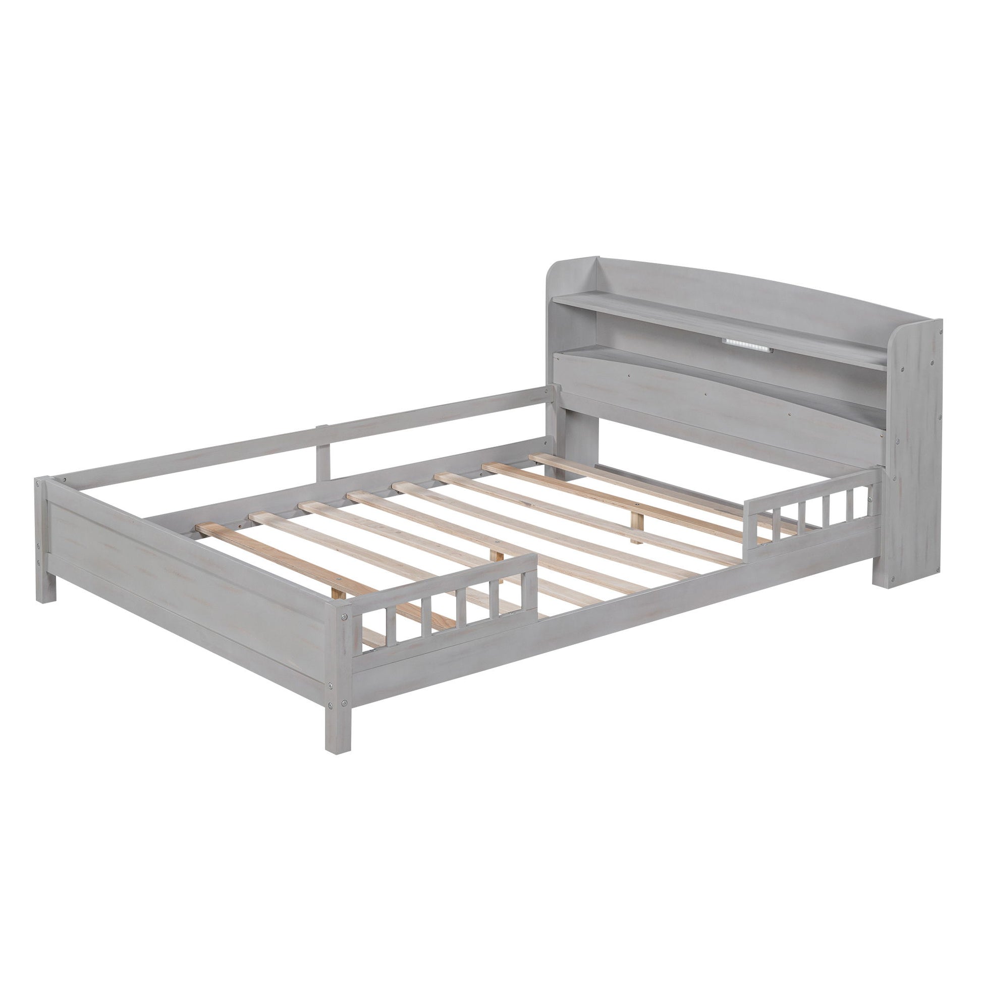 Full Size Platform Bed With LED Light, Storage Headboard And Guardrail - Antique Gray