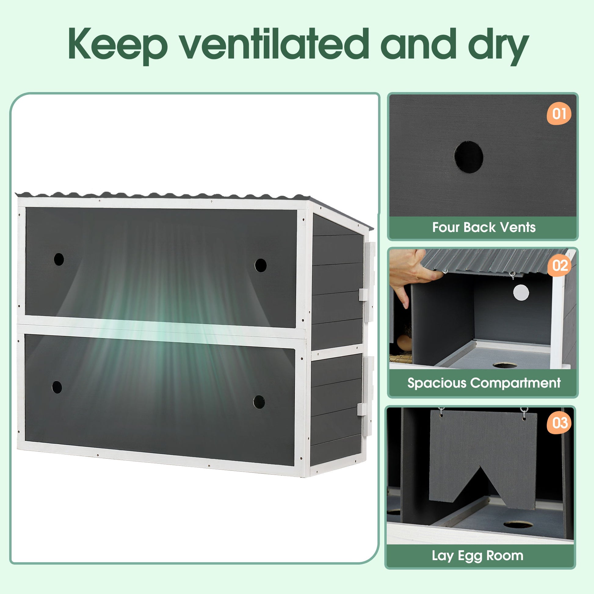 - Outstanding Details: Featuring a slanted roof to deter perching, backside ventilation for fresh air flow, and a foldable perch for easy access, our nesting box prioritizes hens' comfort and hygiene.