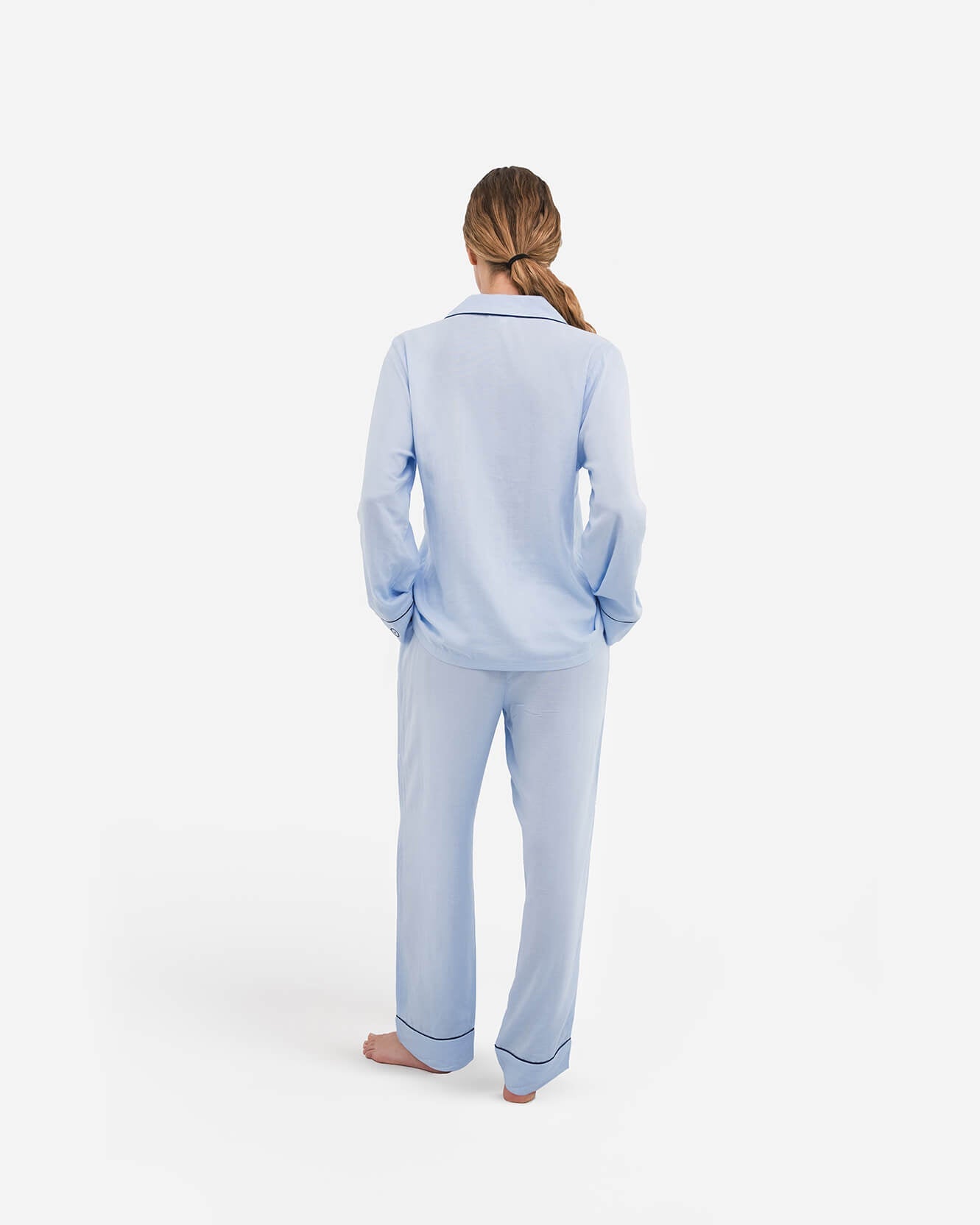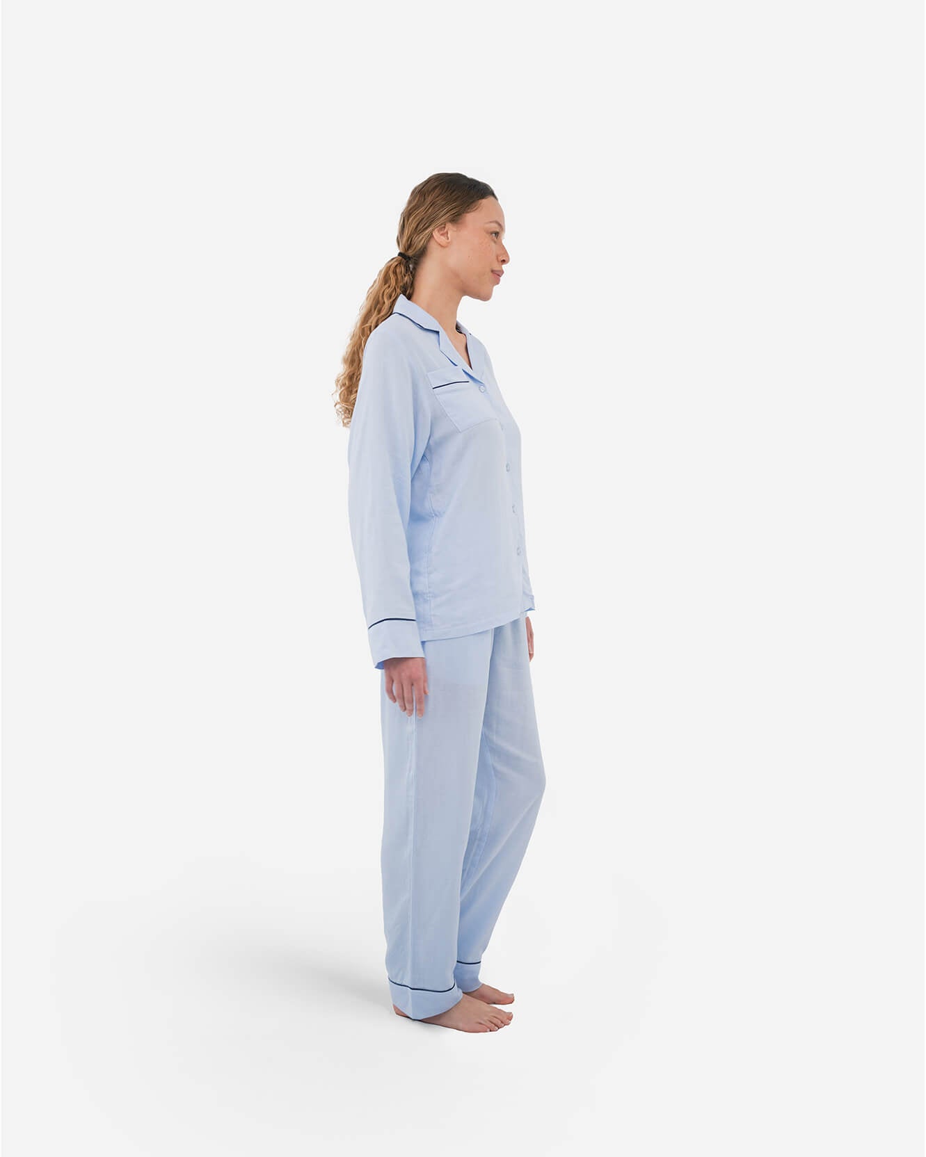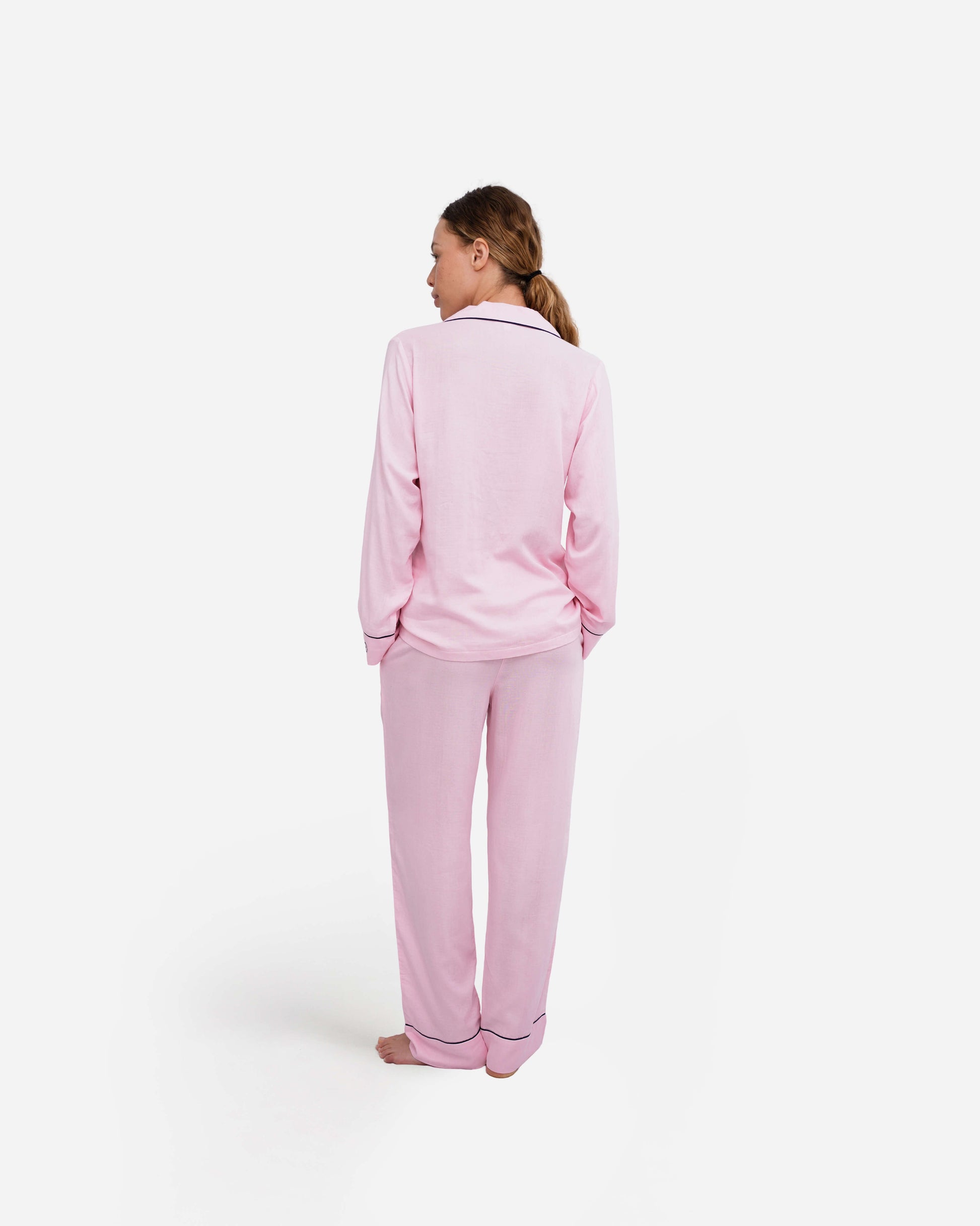 Tailored for ease and everyday comfort, this long PJ set is cut from premium woven cotton selected for its superior softness and breathability. With a relaxed fit and a lightweight drape, it's perfect for year-round lounging. This indoor set brings a polished touch to your bedtime ritual and is finished with contrast piping and our signature embroidery on its sleeve.