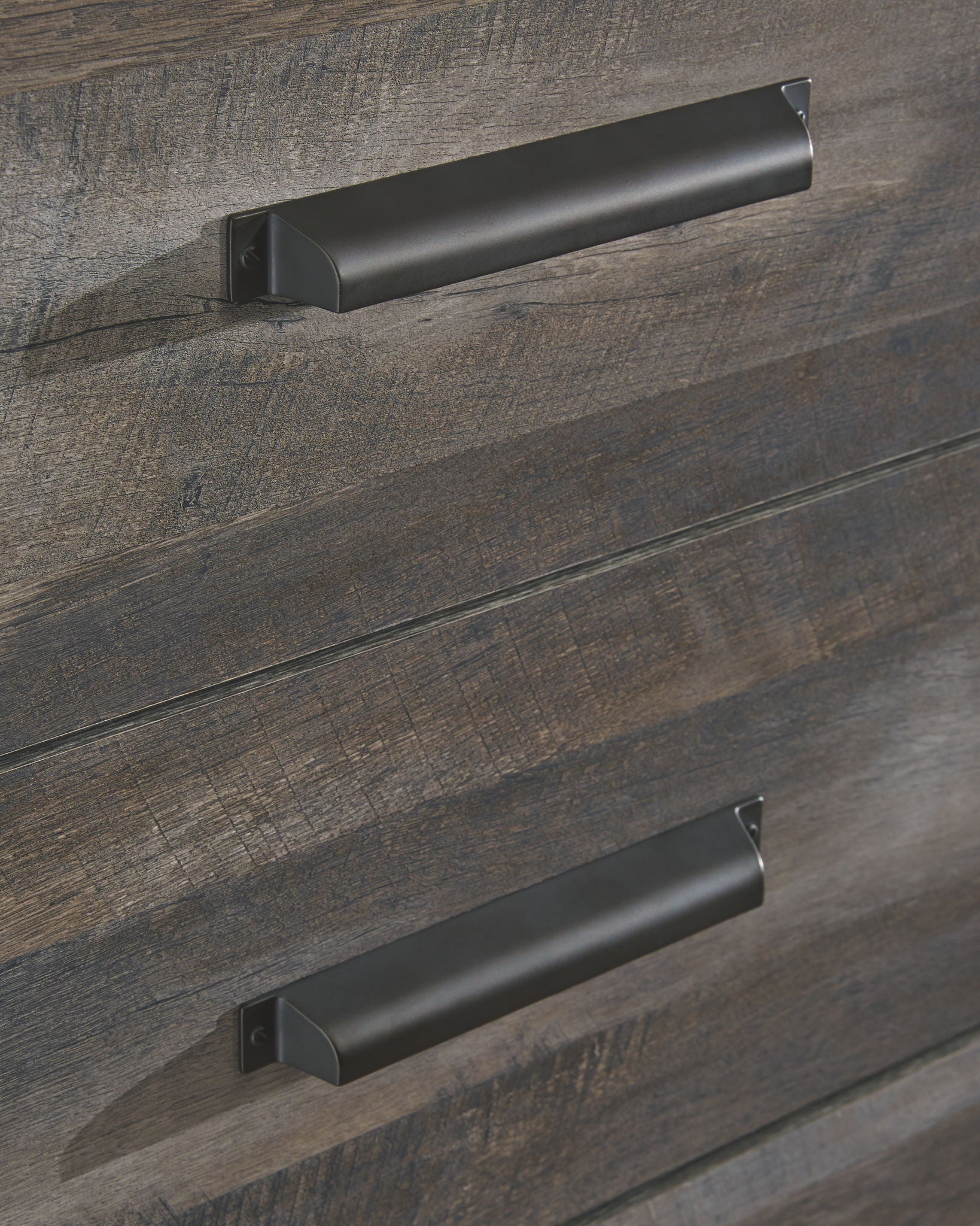 Rustic planked replicated oak grain with authentic touch. Large scaled dark colored hooded pull. Sticks across headboard give a thick planked look. Side roller glides for smooth operating drawers. Cases feature a framed front and pilasters. Large drawers provide ample storage space. Slim profile dual USB charger located on the back of the night stand tops. Queen (67) and king (68) poster headboards feature an upholstered panel with horizontal channel details. King poster bed requires the use of the king poster headboard posts (62). Large scaled bed option (54,56,57,58) with a cross-buck design. The queen (98) rails work with both (64,54) footboards. The king (99) rails work with both (66, 56) footboards. B440-48 has a sliding door over open shelves and five drawers of storage. Headboard and footboard option (53,55) with a cross-buck design. Safety is a top priority, clothing storage units are designed to meet the most current standard for stability, ASTM F 2057 (ASTM International). Drawers extend out to accommodate maximum access to drawer interior while maintaining safety.