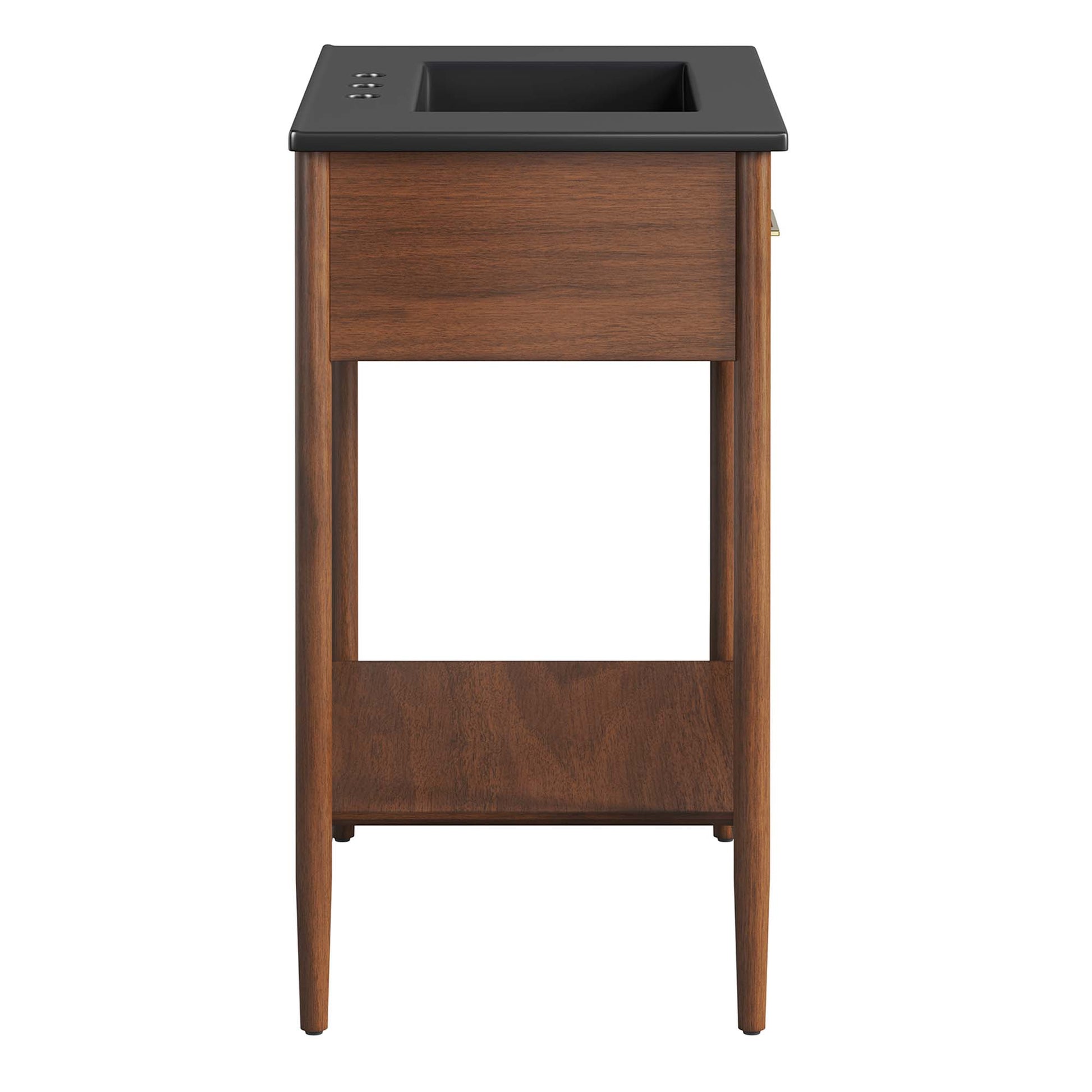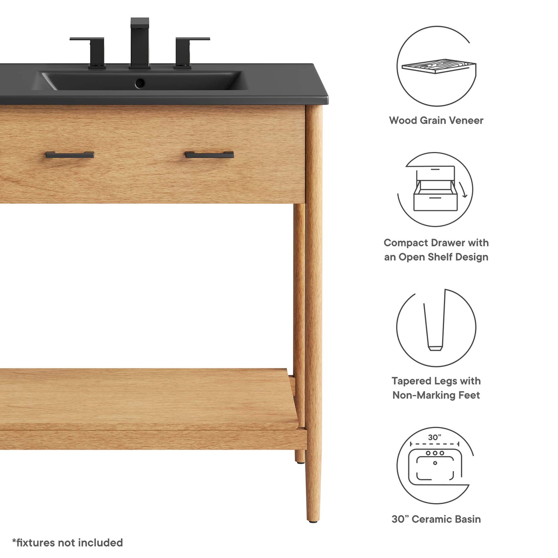 Infuse your bathroom decor with the subtle charm and simplicity of the Zaire 30" Bathroom Vanity. This exquisite washstand combines sleek, contemporary lines with the natural beauty of wood in an organic minimalist design. Crafted from MDF and solid rubberwood and topped with a wood grain veneer, this vanity�s design is emphasized by two metal handle pulls on its drawer, giving it a touch of urban chic. Below this, you'll find an open shelf, ideal for holding towels or showcasing your favorite decorative pieces. Featuring a sleek ceramic basin with 8" widespread holes and an integrated countertop, this vanity easily becomes a functional centerpiece in your bathroom. This vanity�s tapered wood legs are a modest and understated design choice that completes the overall simple mid-century aesthetic. Includes adjustable, non-marking feet for added stability and floor protection. Assembly required. Fixtures not included. Weight Capacity: 375 lbs.