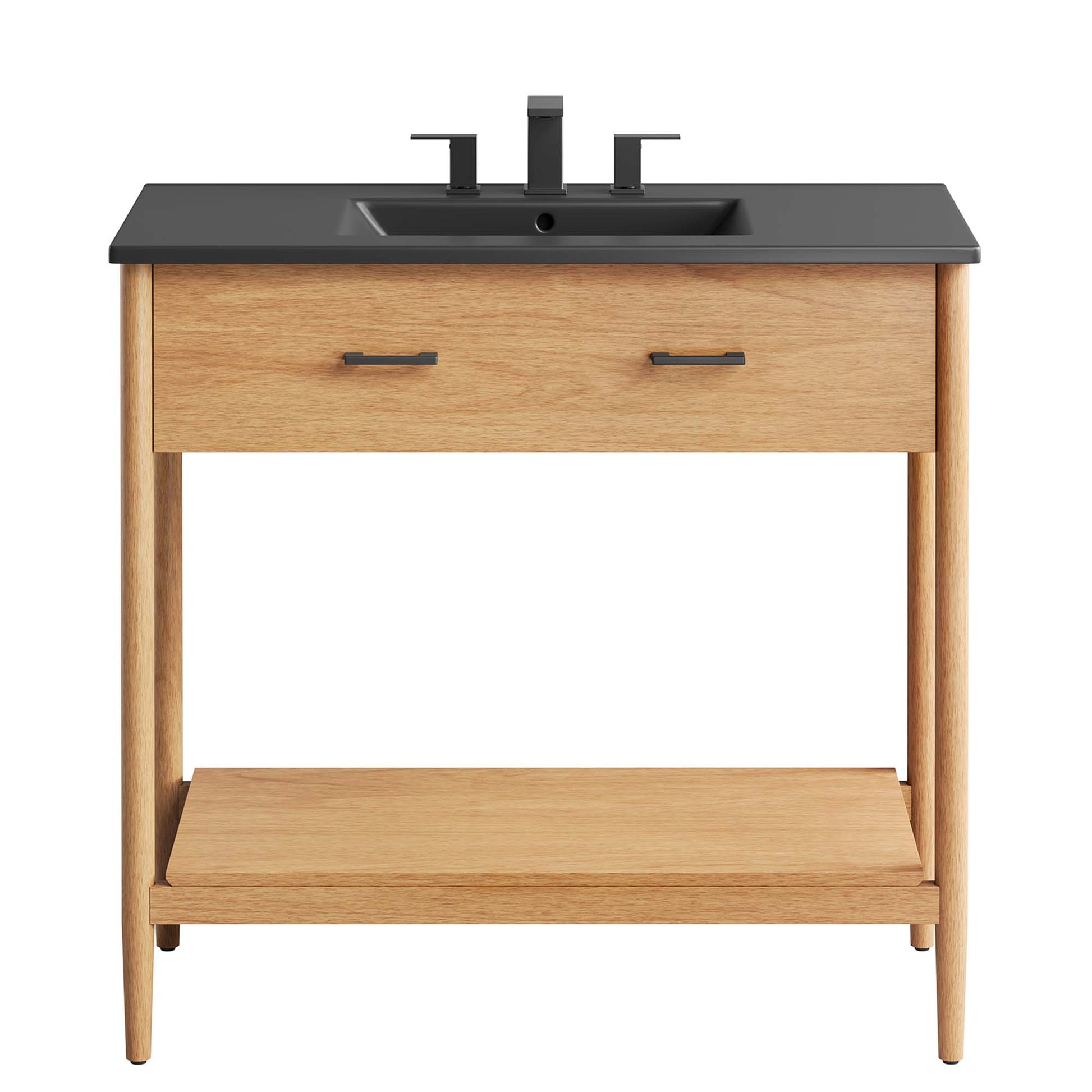 Infuse your bathroom decor with the subtle charm and simplicity of the Zaire 36" Bathroom Vanity. This exquisite washstand combines sleek, contemporary lines with the natural beauty of wood in an organic minimalist design. Crafted from MDF and solid rubberwood and topped with a wood grain veneer, this vanity�s design is emphasized by two metal handle pulls on its drawer, giving it a touch of urban chic. Below this, you'll find an open shelf, ideal for holding towels or showcasing your favorite decorative pieces. Featuring a sleek ceramic basin with 8" widespread holes and an integrated countertop, this vanity easily becomes a functional centerpiece in your bathroom. This vanity�s tapered wood legs are a modest and understated design choice that completes the overall simple mid-century aesthetic. Includes adjustable, non-marking feet for added stability and floor protection. Assembly required. Fixtures not included. Weight Capacity: 375 lbs.