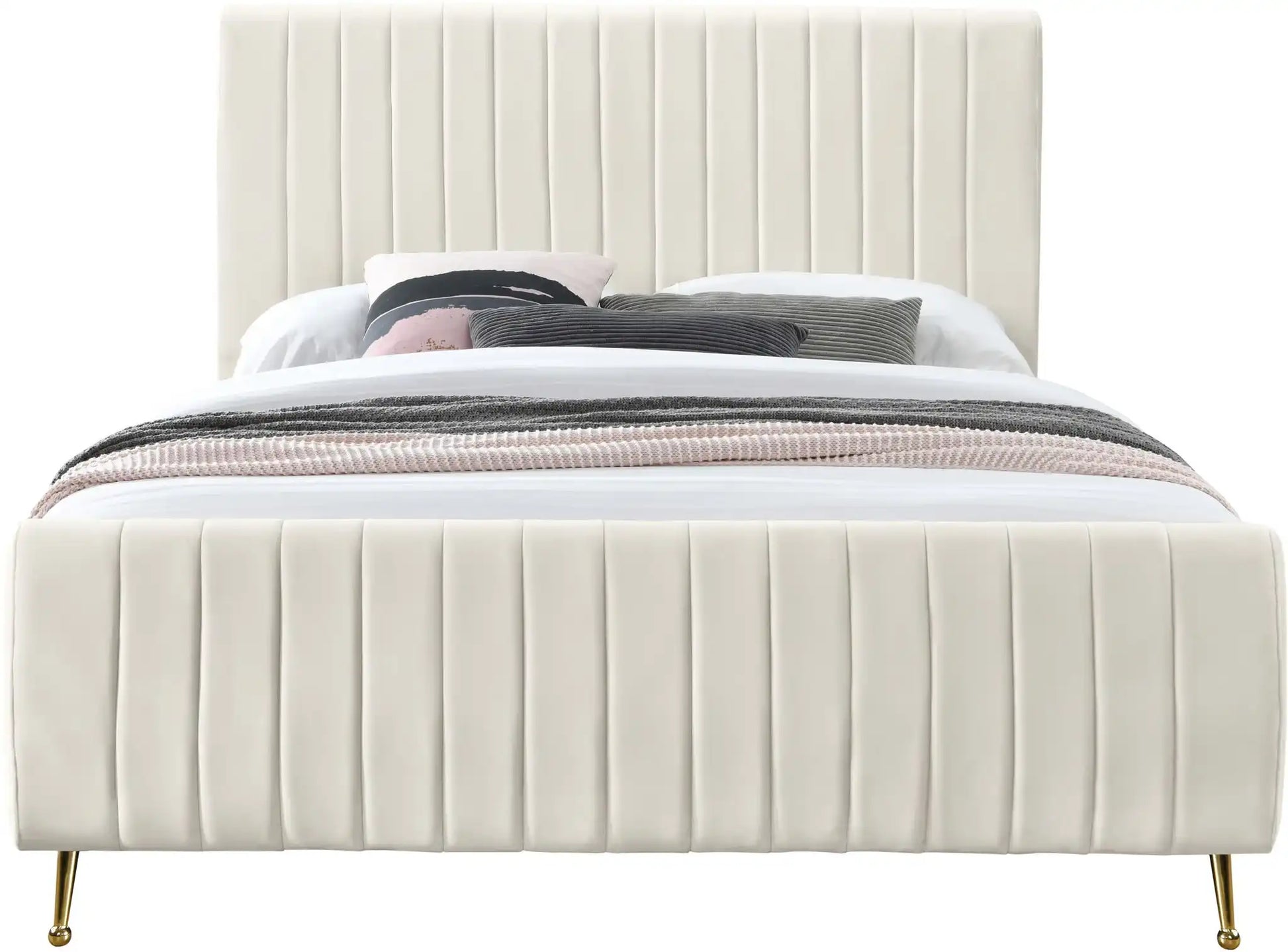 Slip into the lap of luxury with this Zara Bed. This beautiful bed is padded to the max on its headboard and footboard for a look that is nothing short of upscale. The luxe design is amplified by the bed's rich velvet upholstery and its deep detailed channel tufting, which also serves to keep the interior padding aloft, full, and comfortable while you relax or unwind in bed. The bed has legs for a regal touch, and it comes with slats, so it doesn't require a box spring.