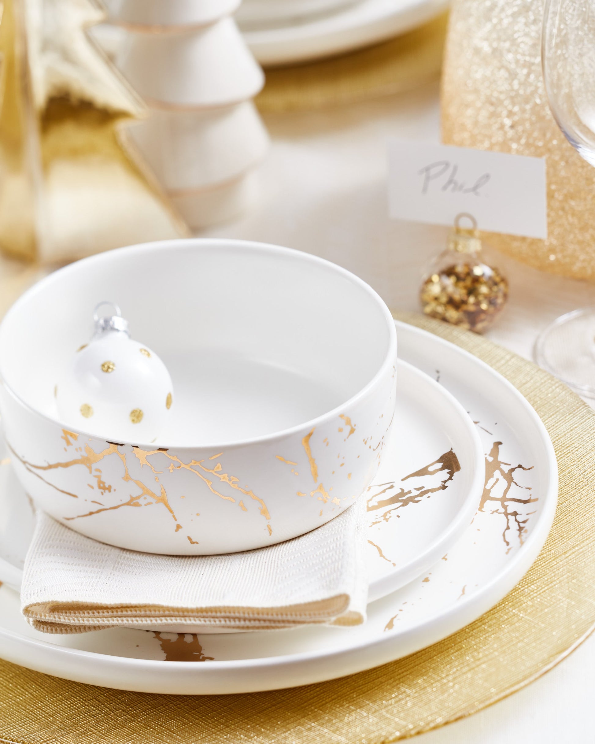 These sleek porcelain tableware settings are accentuated by a brilliant splash of gold. It has a modern art, downtown look and feel. It includes large round dinner plates, classy round salad plates, deep round bowls and rounded 12 oz. mugs. These home essentials are expertly crafted and artfully designed. 100% dishwasher safe for easy cleaning and durability. The hip, trendy design pairs exquisitely with both formal and casual cutlery, as well as with your favorite glassware and tablecloths. Thank you for choosing Stone Lain, where dishes come true.