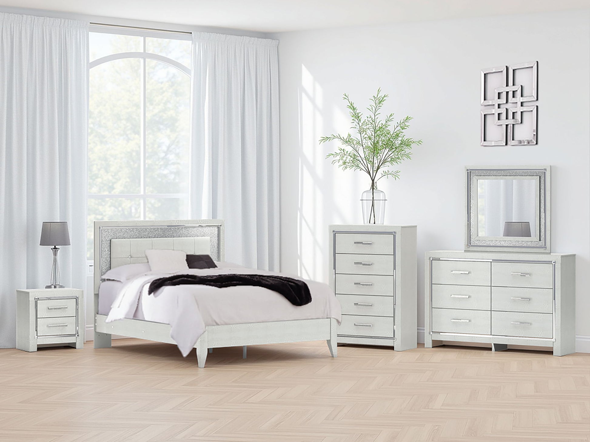 Bright, bold luxury. This upholstered bed dazzles with its attention to detail. Your love of glamorous style is reflected in the tufted upholstery with faux alligator effect, exquisitely paired with faceted chrome-tone and glittery details. Complete with LED lighting around the headboard, it inspires you to live luxuriously every day—from waking up to reading before bed.